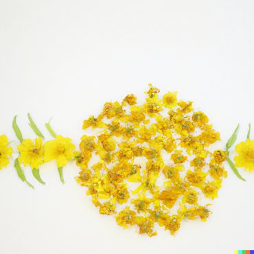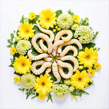 "please give me a very clear photo with a white background shot from above that is yellow and green flowers arranged to look like the small and large intestines. It should look artistic the flowers should be small and dense"