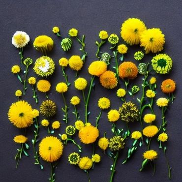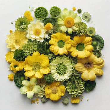 "please give me a very clear photo with a white background shot from above that is yellow and green flowers arranged to look like the small and large intestines. It should look artistic the flowers should be small and dense as well as include many different varieties of flowers and hues"