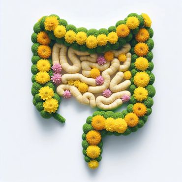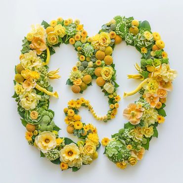 "please give me a very clear photo with a white background shot from above that is yellow and green flowers arranged to look like the small and large intestines. It should look artistic"